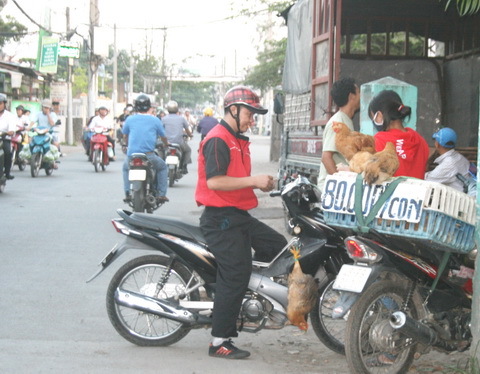 Gà được nhốt trong lồng đặt ở ghế sau xe gắn máy. Trên mỗi lồng đều có một hoặc hai con được cột chân đứng làm mẫu; bên dưới lồng gà, một tấm biển đề chữ thật to: “gà vườn 85.000đ/con”.