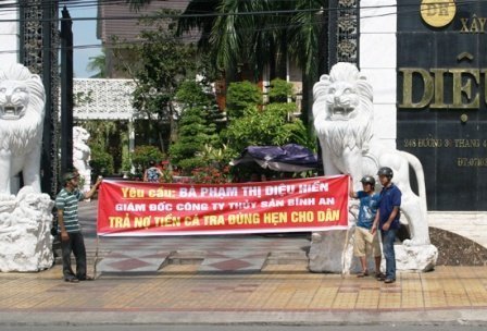 | Nông dân trưng băng rôn đòi nợ trước nhà của bà Diệu Hiền. |