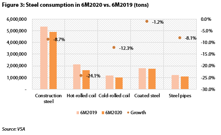 Meanwhile, the steel industry was hit strongly during the pandemic. In the January – June period, the steel industry (including construction steel, coated steel, and steel pipes) produced 8.1 million tons of steel and sold 7.8 million tons, of which 1.4 million tons were exported, decreasing by 6.4%, 7%, and 12.8% year-on-year, respectively. Noticeably, although depending on export, coated steel consumption decreased by just 1.2% year-on-year.