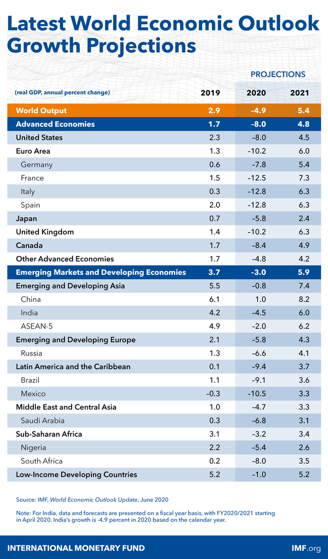 As the Covid-19 pandemic has had a more negative impact on activity in the first half of 2020 than anticipated, global growth is projected at -4.9% in 2020, 1.9 percentage points below IMF’s previous forecast.
