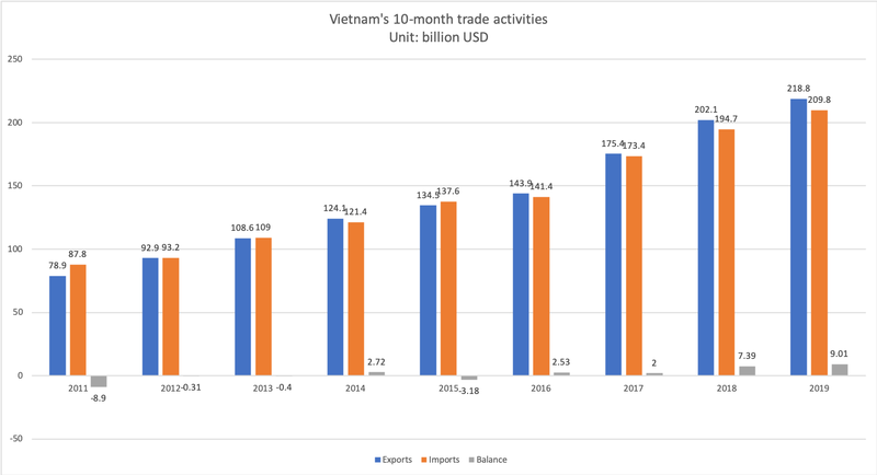 Vietnam recorded a trade surplus of US$1.86 billion in October, leading to a surplus of US$9.01 billion in the first 10 months of 2019, up 23% year-on-year. This is also a record high figure for the 10-month period.