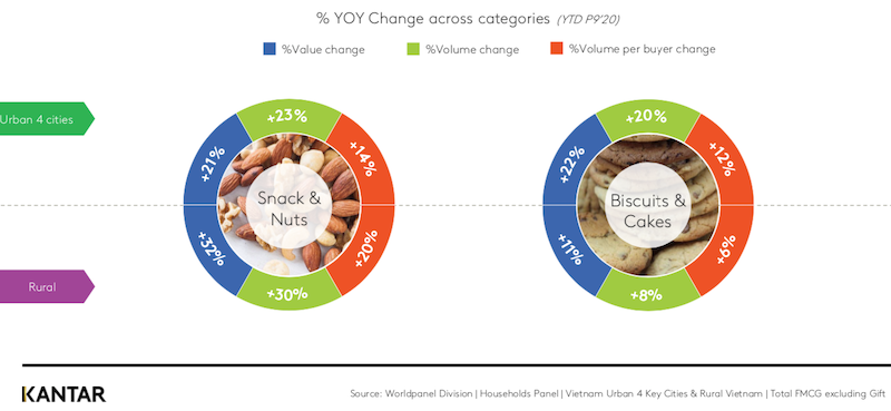 Based on Worldpanel data, within packaged food sector, snacking products still remains double-digital growth in terms of value and volume in the first nine months of 2020 in both Vietnam’s urban and rural areas.