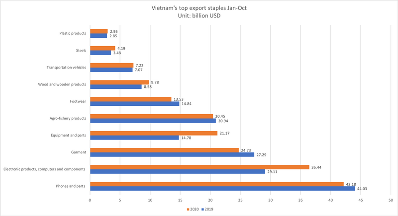 Phones and parts posted the largest export turnover among export items during the January-October period with US$42.18 billion, down 4.2% year-on-year and accounting for 18.3% of Vietnam’s total exports.