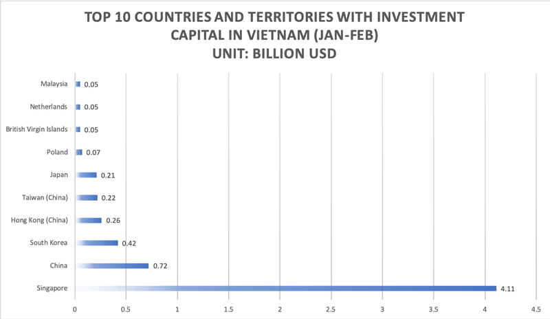 Nevertheless, inflows from Vietnam’s major FDI partners such as China, South Korea, Hong Kong and Japan are still growing in the two-month period. Out of 73 countries and territories investing in Vietnam in the period, Singapore took the lead with US$4.12 billion, China came second with US$720.4 million, while the third place belonged to South Korea with US$425.4 million, followed by Hong Kong, Taiwan and Japan.