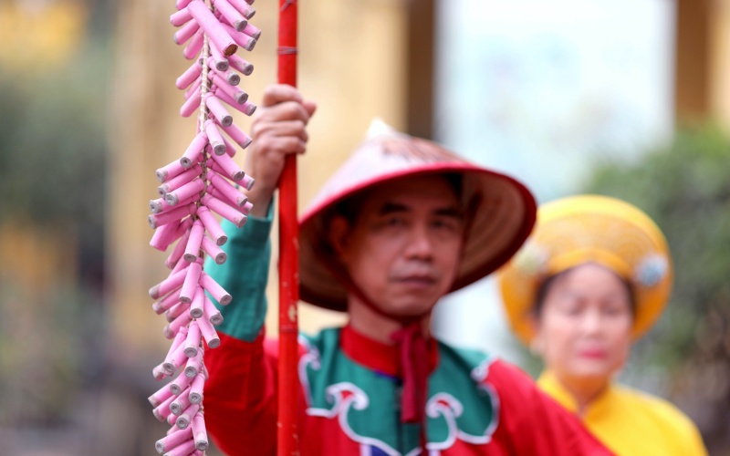 People and soldiers on both sides of the road set off firecrackers to greet the mandarins who perform the ritual.