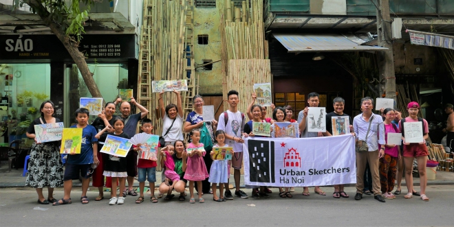 Members of Urban Sketchers Hanoi posing with their sketches at an outdoor activity