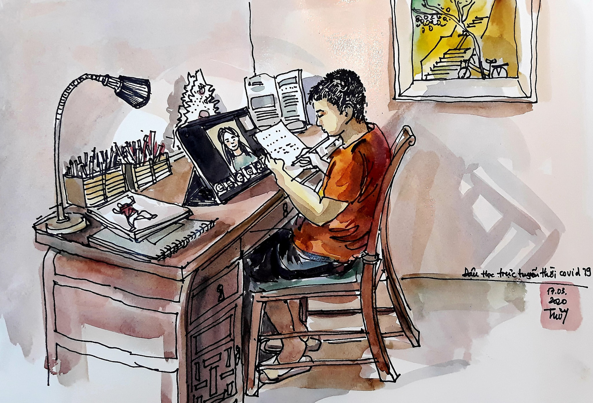 As schools in Vietnam are closed due to COVID-19, artist Tran Thi Thanh Thuy depicts the new reality of classes taught via online platforms.