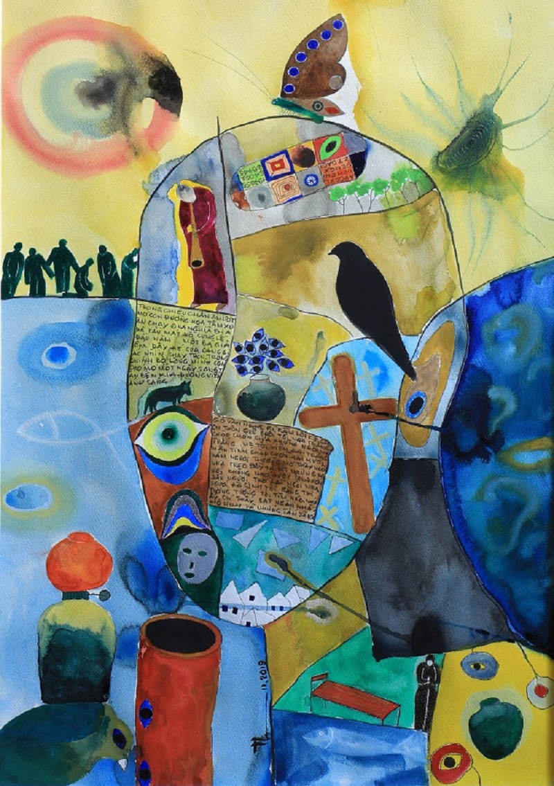 Poet Nguyen Quang Thieu introduces 53 paintings with various materials in his first solo exhibition called "The flute player", which opens to public from January 7 to 15, 2021.