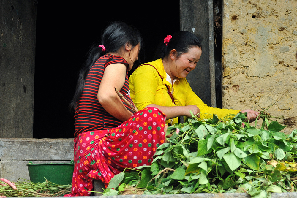 Women picking green peas.