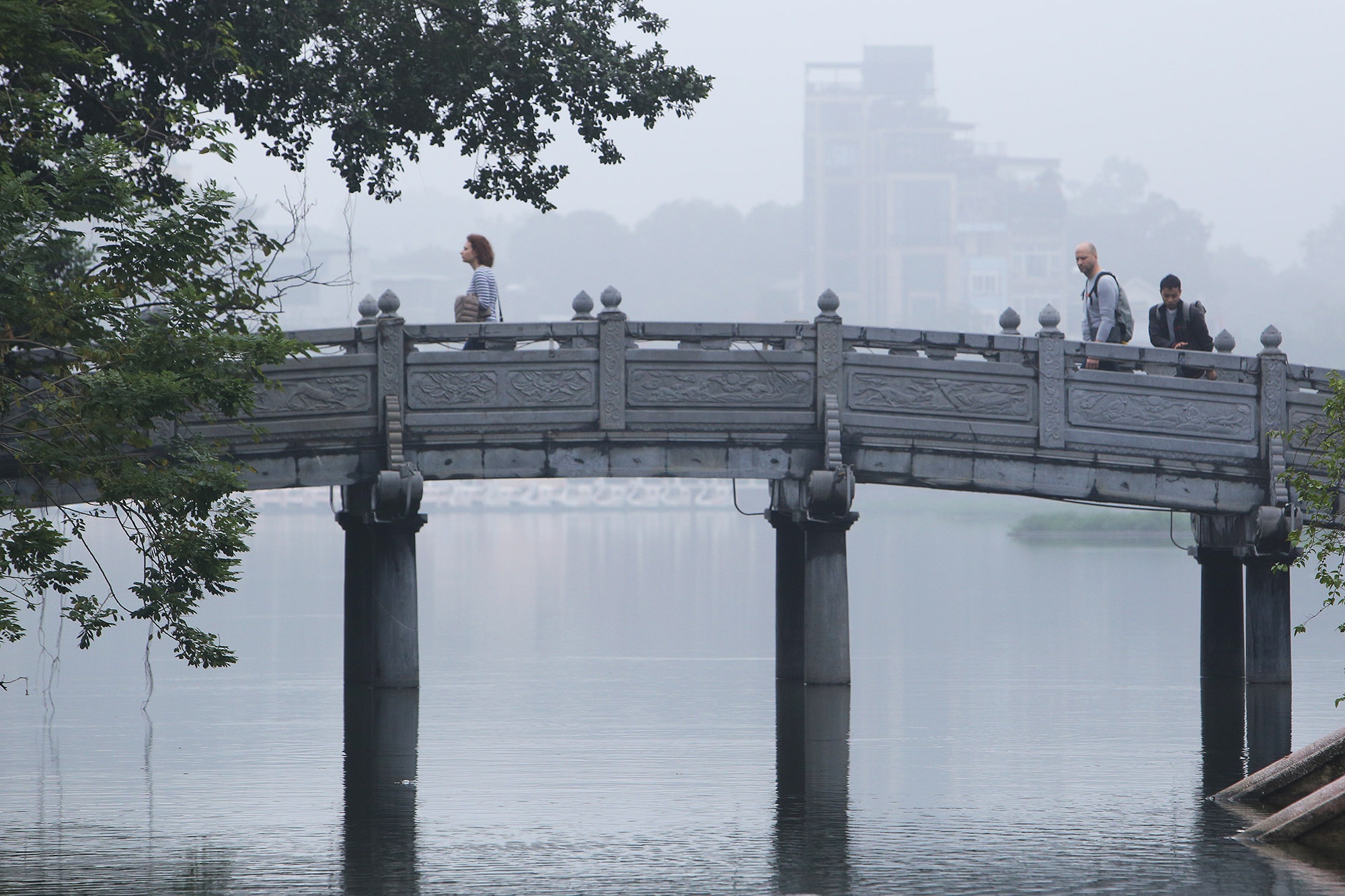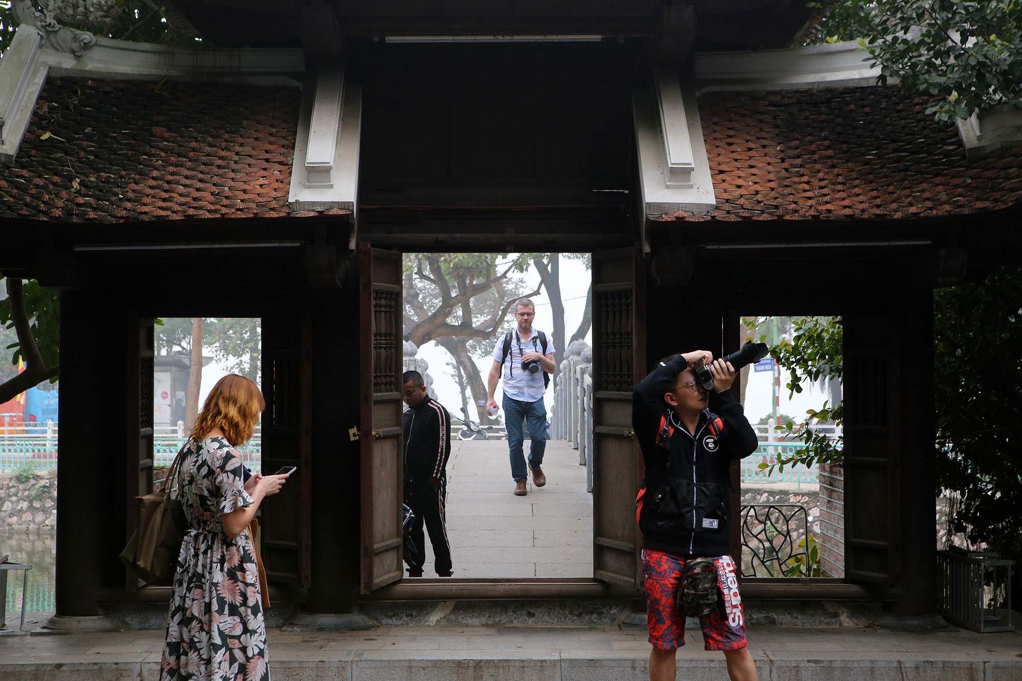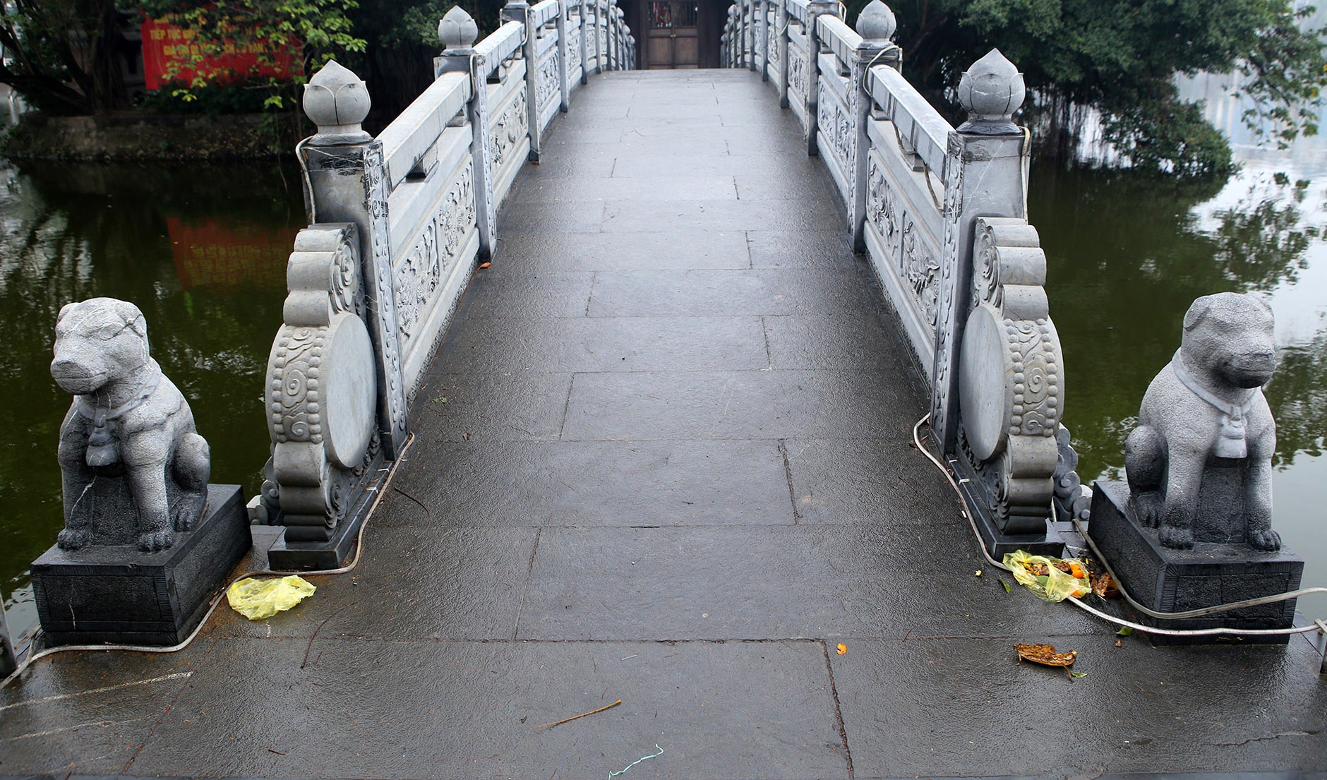 The temple is covered under the trees in the middle of Truc Bach Lake and few people know about it. A stone dog which is considered the villagers' tutelary god is placed on the stone bridge leading to the temple.