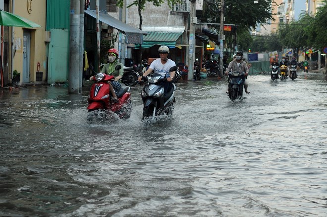 Vehicles wade through floodwater caused by tidal surges on An Binh street in District 5, HCM City, in October 2018