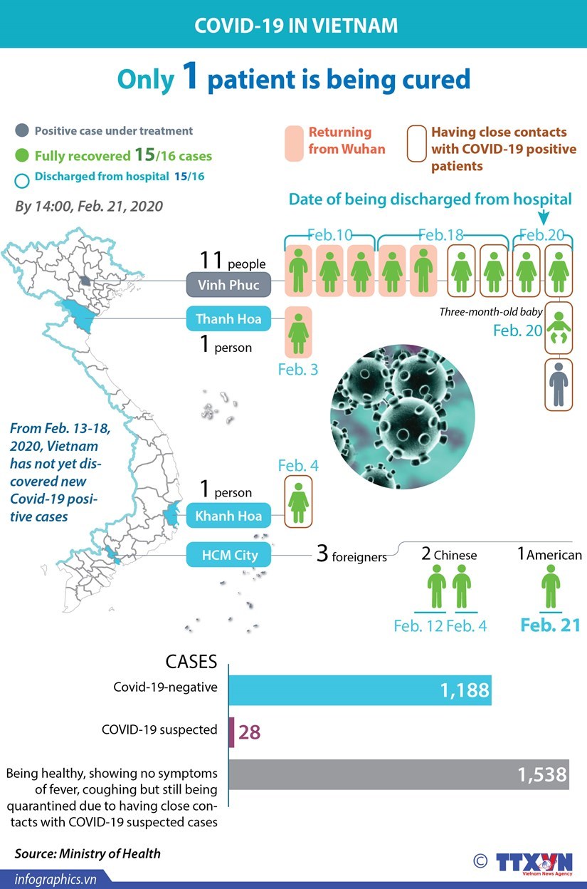As of February 21 afternoon, 15 of the 16 patients with COVID-19 in Vietnam had been cured and discharged from hospital. The 15th case, a Vietnamese American, at HCM City’s Tropical Diseases Hospital repeatedly tested negative from February 12 – 17 and was discharged on February 21.