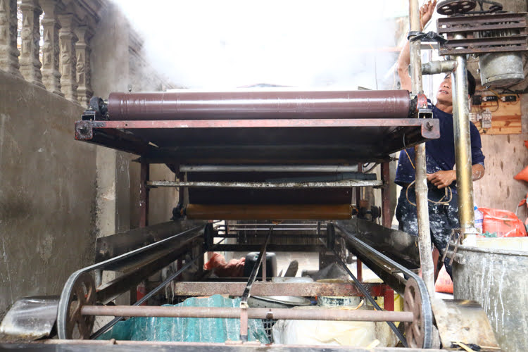 First, pasta makers grind arrowroot into a flour, then mix it with water to create a paste. The paste is then smeared into a thin pancake on a bamboo tray, steamed, then dried in the sun.