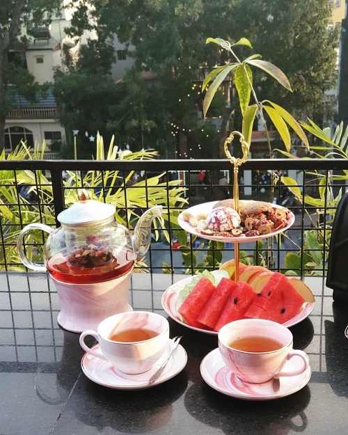 The tea house located in the narrow street of Khuc Hao in Ba Dinh district opens from 9 am to 11 pm. The two-story building and its premises are designed with a beige tone and carefully decorated for the best photo shootings.