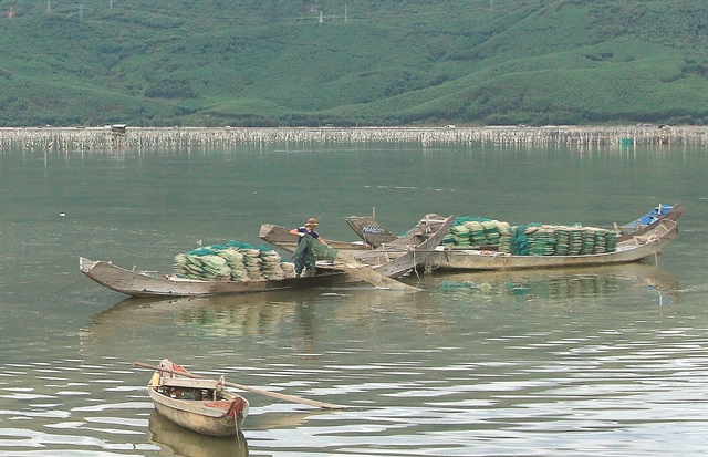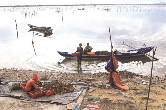 Farmers fish and keep cages of oysters on the lagoon, raising the oysters in old tyres tied up on bamboo sticks. Along the road surrounding the lagoon, there are stalls selling fresh oysters and other creatures from the lagoon.