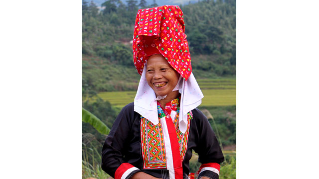 A Dao Thanh Phan woman with gold-covered teeth and a high patterned hat.