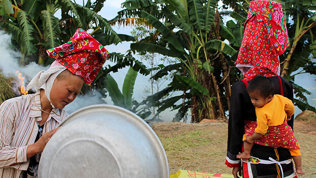 A Dao Thanh Phan woman slings her baby while harvesting rice with her family.