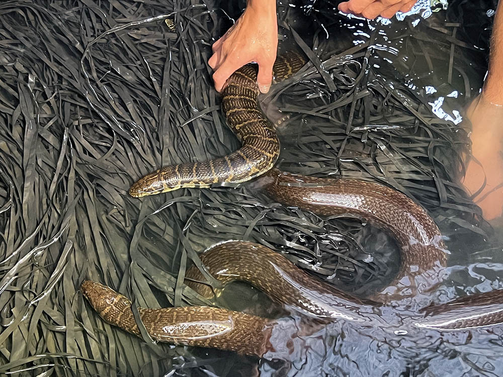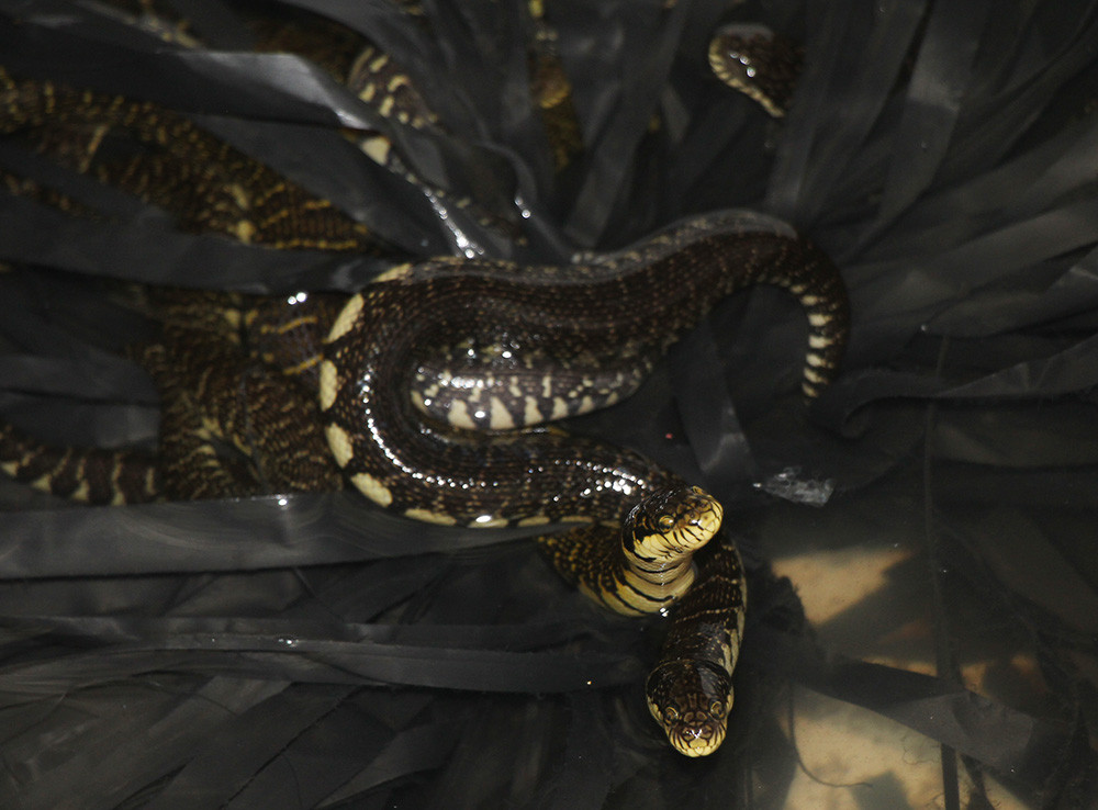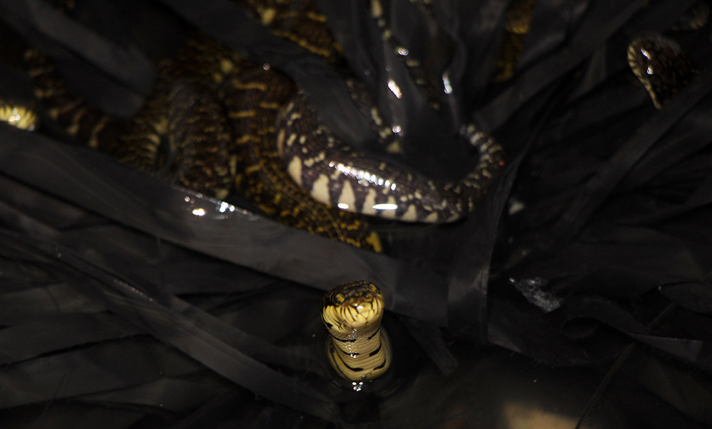 Nuôi rắn trong bể xi măng, anh dễ theo dõi được tập tính sinh hoạt của rắn và quan sát chất lượng nước. Nếu con nào bệnh thì bắt ra ngoài để trị. Trong bể, anh để dây nilon để rắn trốn bên dưới. “Lâu lâu có con rắn ri voi bị nấm da thì anh bắt ra ngoài, pha thuốc ngâm; sau đó rắn thay da là hết”, anh kể.