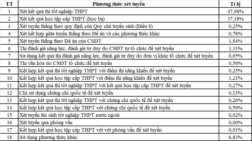 Trong đó, tỉ lệ thí sinh nhập học trên toàn quốc theo phương thức xét kết quả thi tốt nghiệp THPT là cao nhất, với 47,98%. Phương thức xét tuyển có tỉ lệ thí sinh nhập học thấp nhất là phỏng vấn, với 0%.