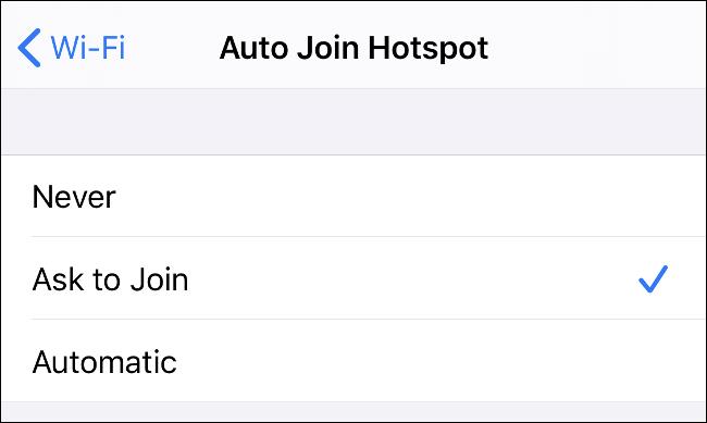 Hãy mở ứng dụng Settings (Cài đặt) > Wi-Fi và chọn thiết lập "Auto Join Hotspot" (Tự động kết nối vào các điểm truy cập) sang "Ask to Join" (Hỏi trước khi truy cập) để máy thông báo cho bạn bất cứ khi nào nó kết nối vào mạng mới. Nếu chọn "Automatic" (Tự động), thì iPhone của bạn có thể tự động kết nối mà không hỏi ý kiến người dùng.