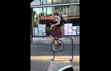 Đi xe đạp 1 bánh thổi kèn trên hè phố