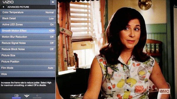 Tính năng tự động làm mịn chuyển động được cài đặt mặc định trong hầu hết những TV hiện nay thường bị tắt đi (như ảnh trên). Nếu không tắt đi, nó thường khiến hình ảnh chuyển động dễ có hiện tượng mờ và tạo quầng xung quanh.