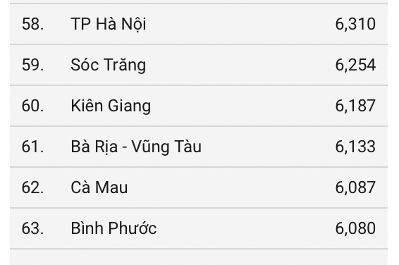 Các địa phương còn lại trong top 10 còn: Bắc Ninh, Hà Tĩnh, Yên Bái, Phú Thọ, Vĩnh Phúc, Hà Nam, Nghệ An.