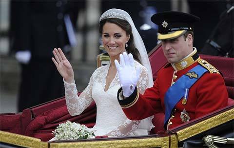 Vợ chồng Hoàng tử William vẫy chào dân chúng trên đường tới cung điện Buckingham |