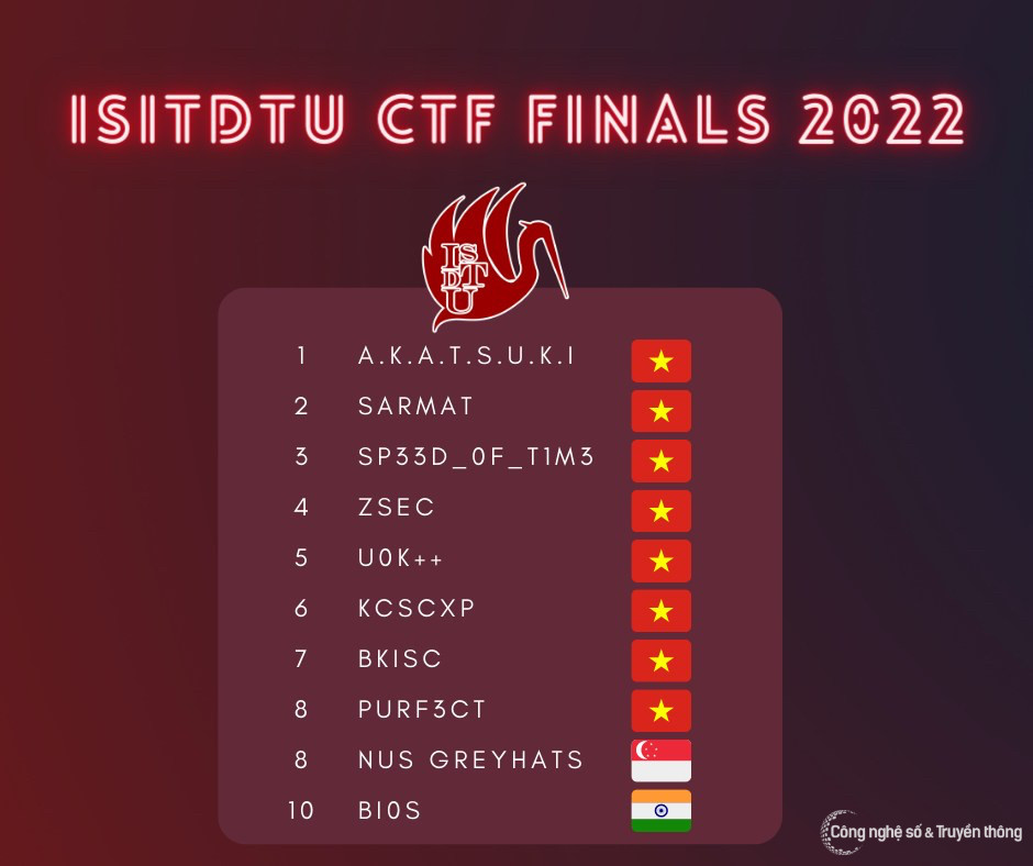 Cuộc thi An toàn thông tin ISITDTU CTF 2022 cũng nằm trong chuỗi các sự kiện nhằm thúc đẩy các hoạt động đào tạo và phát triển nguồn nhân lực an toàn thông tin tại Việt Nam thuộc Đề án “Đào tạo và phát triển nguồn nhân lực an toàn thông tin giai đoạn 2021 – 2025.