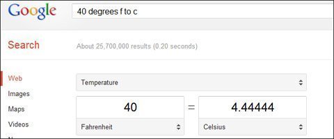 Google có thể chuyển đổi giữa nhiều đơn vị khác nhau. Chỉ cần gõ một tìm kiếm theo dạng "x unit to unit" (x là con số nào đó). Chẳng hạn, bạn muốn đổi đơn vị 40 độ F ra độ C, hãy gõ "40 degrees f to c".