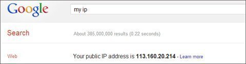 Bạn có thể xem địa chỉ IP của mình bằng cách gõ " what is my ip" vào Google hoặc chỉ cần gõ lệnh tìm kiếm "my ip".