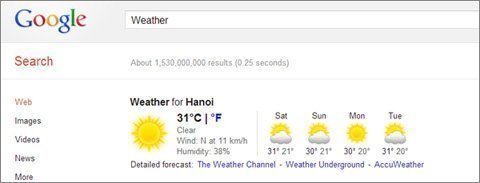 Nếu bạn chỉ gõ "weather" mà không gõ thêm địa điểm cụ thể, Google sẽ ra kết quả thời tiết tại khu vực bạn đang sống. Ví dụ, bạn ở Hà Nội, chỉ cần gõ "weather" vào Google, bạn sẽ có kết quả là thời tiết Hà Nội vào ngày hôm nay và 3 ngày sau. Tuy nhiên, tính năng tìm kiếm này chỉ áp dụng với trang Google bản địa (google.com.vn), chứ không thực hiện được trên trang google.com.