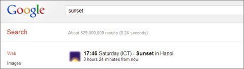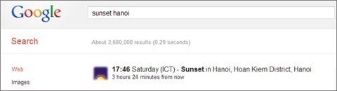 Cũng như với tìm kiếm thời tiết, nếu bạn gõ "sunrise"/"sunset" mà không gõ địa điểm, Google sẽ trả về kết quả là thời gian mặt trời mọc/lặn tại nơi bạn đang ở.