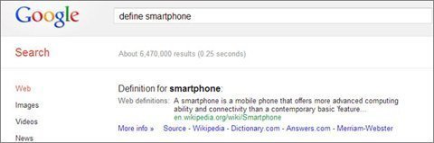Để xem định nghĩa từ điển của một từ, hãy gõ từ khóa "define" phía trước từ cần định nghĩa ví dụ "Define smartphone", Google sẽ cho bạn biết định nghĩa của từ đó, cùng với một nút và bạn có thể click vào đó để nghe cách đọc từ.
