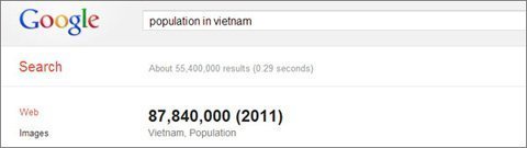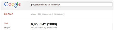 Bạn có thể xem nhiều loại dữ liệu về một thành phố, đất nước cụ thể như tỷ lệ dân số và tỷ lệ thất nghiệp. Ví dụ, muốn biết dân số Việt Nam, bạn chỉ cần gõ "population vietnam" hoặc "population in vietnam". Với các thành phố, thử tìm dân số của Hà Nội và TP.HCM theo cách này thì Google chỉ có dữ liệu năm 2008 của TP.HCM và không có dữ liệu về Hà Nội. Có lẽ Google không có đủ thông tin về dữ liệu về dân số của các thành phố ở Việt Nam để cung cấp.