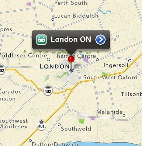 7. Nếu người dùng gõ “London” để tìm kiếm bằng Apple Maps mà không thêm cụm “UK” để truy vấn thì Apple Maps sẽ đưa tới một địa danh ở Canada.