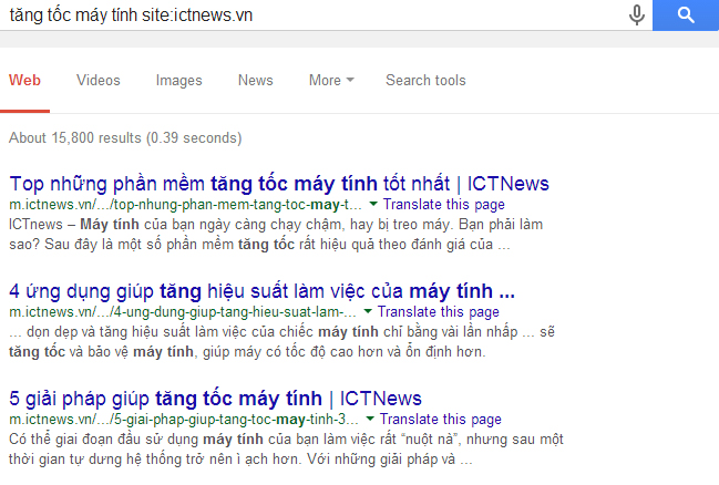 Chẳng hạn bạn nhớ đã từng đọc một bài viết rất hữu ích của ICTnews về cách tăng tốc máy tính, và giờ bạn muốn tìm lại bài viết đó. Nếu lên Google và tìm từ khóa “tăng tốc máy tính” thì có vô vàn kết quả hiện ra, không chỉ từ ICTnews mà còn rất nhiều trang khác. Để tìm lại đúng bài viết đó, hãy thêm cấu trúc: site:ictnews.vn vào từ khóa để lọc riêng các kết quả từ ICTnews, chẳng hạn với từ khóa “tăng tốc máy tính site:ictnews.vn” bạn sẽ được kết quả sau: