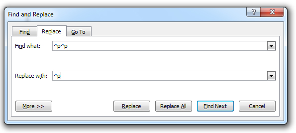Nhiều người thường có thói quen xuống dòng 2 lần (nhấn 2 lần phím Enter), khiến cho văn bản có nhiều dòng trống giữa các đoạn. Nếu bạn đang phải xử lý những văn bản kiểu này và chán ngán với việc dò từng đoạn để xóa dòng trống, bạn có thể sử dụng chức năng tìm kiếm và thay thế (Find and Replace) của Microsoft Word để tiết kiệm công sức và thời gian, cách làm như sau: nhấn tổ hợp Ctrl+H, nhập ^p^p tại ô Find và ^p tại ô Replace. Cuối cùng nhấn Replace all để xóa toàn bộ dòng trống trong văn bản.