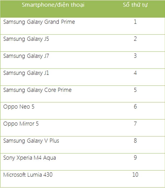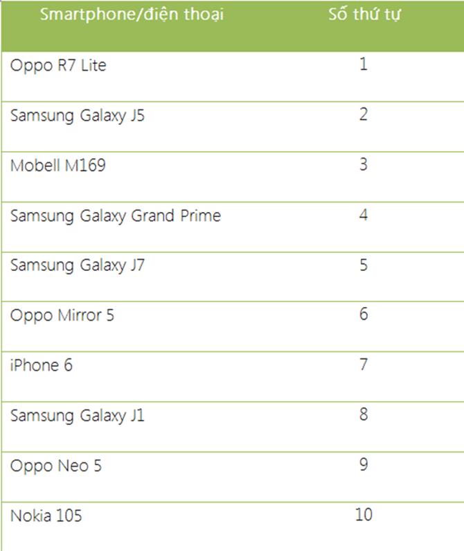 Trên hệ thống của FPT Shop, Oppo còn thành công hơn khi chiếc R7 Lite thuộc phân khúc tầm trung với thiết kế kim loại nguyên khối vừa bán ra đã có mặt ở vị trí đầu tiên. Hai chiếc Oppo Mirror 5 và Oppo Neo 5 cũng có mặt trong top, giúp thương hiệu này có tới 3 sản phẩm nằm trong top 10, chỉ đứng sau Samsung (có 4 sản phẩm).