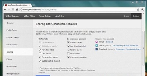 Thực hiện: Để thiết lập kết nối, bạn tiến hành đăng nhập vào trang YouTube, sau đó nhấn vào tên đăng nhập của bạn ở phía trên bên phải trình duyệt, sau đó chọn "Cài đặt" (Settings), chọn tiếp "Chia sẻ" (Sharing). Tại đây, bạn có thể kết nối với tài khoảng YouTube với tài khoảng Facebook, Twitter và Orkut. Tiếp tục thiết lập các tùy chọn chia sẽ, sau đó nhấn Lưu lại cài đặt (Save Settings).