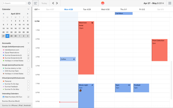 Dù Google Calendar hiện được rất nhiều người tin dùng khi cần sắp xếp lịch làm việc, nhưng nếu bạn cần quản lý nhiều tài khoản Google cùng lúc thì Sunrise Calendar mới là cái tên xứng đáng được nhắc tới. Ngoài các tài khoản Google, Sunrise còn có thể đồng bộ lịch với iCloud và Facebook Calendar.