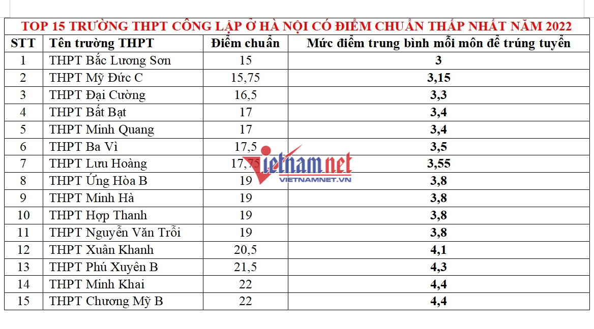 Cụ thể, top 15 trường có điểm chuẩn lớp 10 thấp nhất Hà Nội như sau: