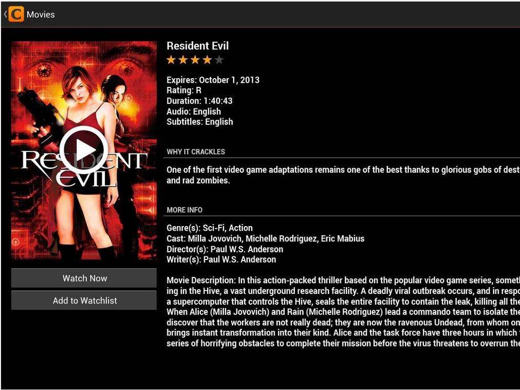Crackle có rất nhiều phim miễn phí cho bạn xem trực tuyến. Ứng dụng cập nhật phim và chương trình truyền hình mới mỗi tháng. Bạn có thể tạo danh sách phim và chương trình để xem lại sau. Điểm hấp dẫn của Crackle là bạn không phải trả phí thuê bao.