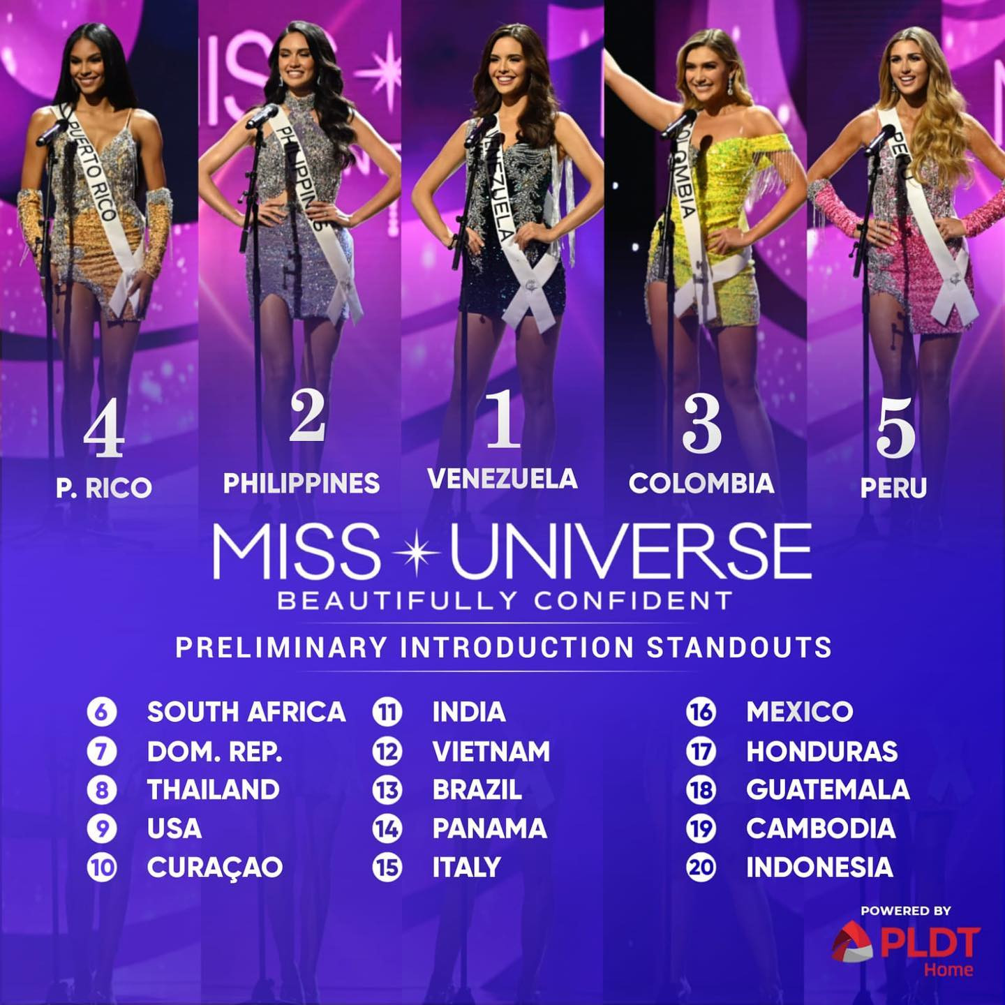 Chuyên trang sắc đẹp với hơn 155 nghìn người theo dõi Sash Factor đã có sự bình chọn chi tiết nhất cho các phần trình diễn trong đêm bán kết. Theo chuyên trang, top 5 phần trình diễn giới thiệu bản thân gọi tên đại diện Venezuela, Philippines, Colombia, Puerto Rico và Peru.