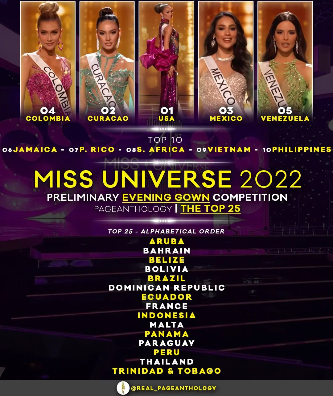 Đại diện đến từ Mỹ, Colombia, Curacao, Thái Lan và Peru được đánh giá là 5 thí sinh có phần trình diễn trang phục dạ hội đẹp nhất. Có thể thấy, đại diện Colombia, Venezuela và Philippines là 3 thí sinh được chuyên trang này quan tâm và đánh giá cao trong cả 3 phần thi.