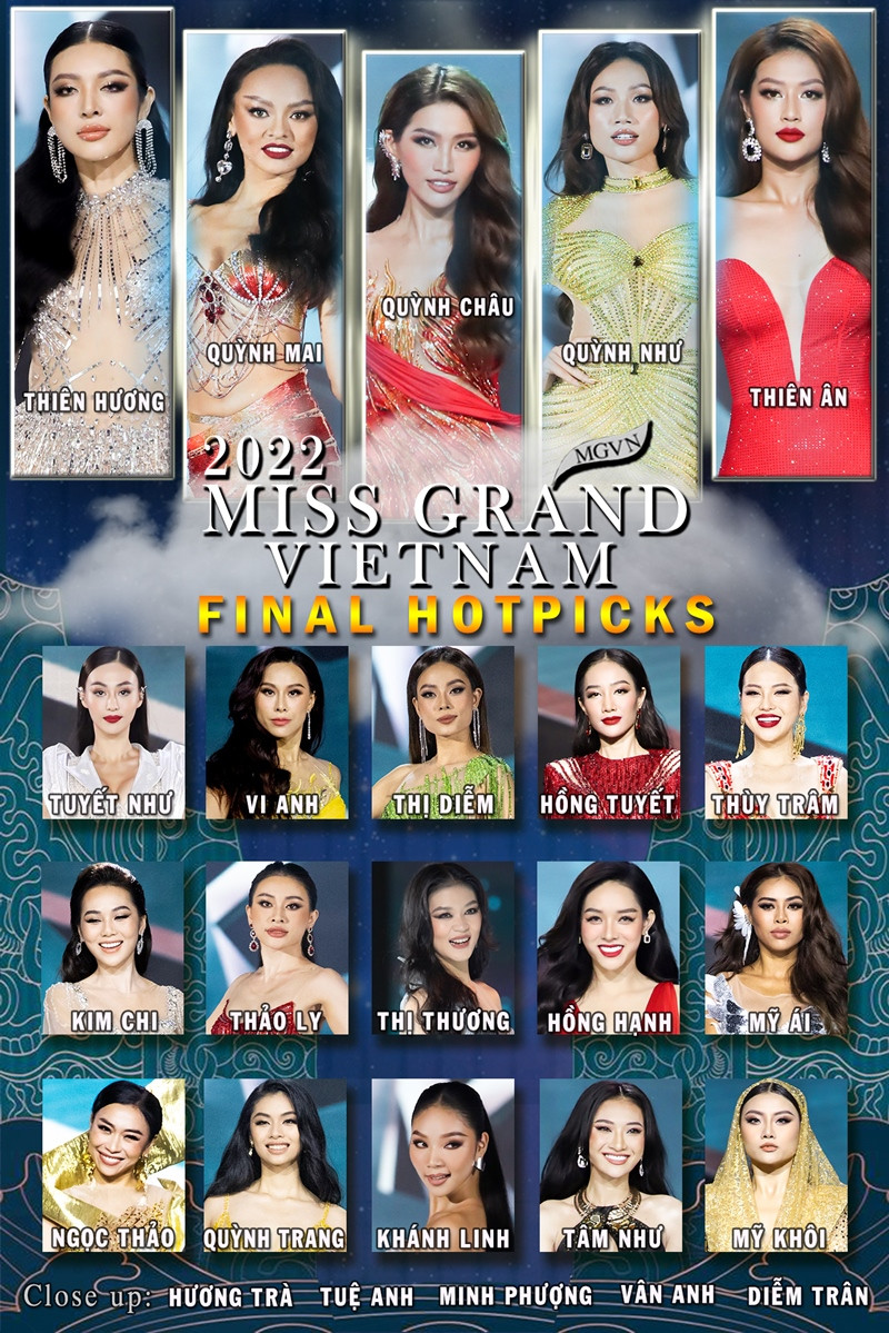 Bảng dự đoán kết quả Miss Grand Vietnam 2022 của VietNamNet.Chế Nguyễn Quỳnh Châu tự tin, bản lĩnh, xây dựng được màu sắc cá tính, giữ vững phong độ và được đánh giá cao từ kỹ năng, phong thái đến giao tiếp. Phần trình diễn của cô trong đêm thi chung khảo cũng chưa thật sự gây bất ngờ nhưng Quỳnh Châu dung hòa được ngoại hình và kỹ năng. Khuyết điểm lớn nhất của Quỳnh Châu là hình thể khá mỏng. Cô là ứng viên hàng đầu được kỳ vọng sẽ tiếp nối Thùy Tiên, đeo sash Việt Nam tại đấu trường Miss Grand International 2022. Ngô Thị Quỳnh Mai sở hữu nguồn năng lượng tích cực, tinh thần thi đấu máu lửa trong suốt cuộc thi. Xuất thân là vũ công và đạt được các thành tích nhất định ở Hoa hậu Hoàn Vũ Việt Nam 2015, Asian Next Top Model 2016, The Face Vietnam, người đẹp tạo dấu ấn riêng bằng kỹ năng và kinh nghiệm nên luôn nổi bật. Ở đêm thi chung khảo, cô trình diễn áo tắm mang đậm chất riêng, thậm chí tái hiện màn vẽ chân mày quen thuộc và đầy gợi cảm, uyển chuyển trong phần thi trang phục dạ hội. Đặc biệt, cô như "cá gặp nước" ở các màn đồng diễn, rất nổi bật về vóc dáng và đầy tự tin thể hiện vũ đạo so với các thí sinh.Đỗ Trịnh Quỳnh Như đến từ TP. Hồ Chí Minh có kinh nghiệm thi thố sắc đẹp ấn tượng, từng giành ngôi quán quân Vietnam Fitness Model 2017, Top 5 Hoa Khôi Du Lịch Việt Nam 2017, Đại diện Việt Nam tại Miss Model Of The World 2017 tại Trung Quốc, Người đẹp thể thao tại Hoa hậu Siêu Quốc Gia Việt Nam 2018 - Miss Supranational Vietnam 2018, Top 10 Hoa khôi Áo Dài 2016, lọt Top 41 Miss Universe Vietnam 2022. Tại cuộc thi, cô thể hiện khả năng giao tiếp tốt, thắng phần thi English Speaking Workshop. Trong đêm chung khảo, Quỳnh Như có màn trình diễn dạ hội tạo hiệu ứng. Hạn chế lớn nhất của Quỳnh Như là khuôn mặt khá cứng, chưa toát lên thần thái nữ hoàng sắc đẹp thường thấy.Bùi Lý Thiên Hương là gương mặt quen thuộc trên đấu trường nhan sắc Việt. Hơn 2 tháng trước, Thiên Hương lọt top 16 của thi Hoa hậu Hoàn vũ Việt Nam 2022. Sau hai phần trình diễn của đêm chung khảo, Thiên Hương được xếp vào nhóm ứng viên mạnh, có kỹ năng tốt, catwalk ấn tượng, phong thái tự tin. Hạn chế lớn nhất của cô là khả năng ngoại ngữ khi thi đấu quốc tế.Đoàn Thiên Ân sở hữu vẻ ngoài bắt mắt cùng với gương mặt đẹp, từng đăng quang Hoa khôi Áo dài Nữ sinh 2018. Sau đêm trang phục văn hoá dân tộc, Thiên Ân xuất hiện trên khắp diễn đàn sắc đẹp và được đánh giá cao cho ngôi vị hoa hậu với thần thái rực rỡ trên sân khấu. Trong đêm chung khảo, Thiên Ân khá lúng túng trong việc xử lý trang phần trang phục dạ hội, nhưng khá hơn ở phần hô tên và trình diễn áo tắm.Trần Tuyết Như tốt nghiệp El Camino College (California), từng đạt á hậu 1 Hoa hậu Hữu nghị Trung Quốc - Châu Á 2017, lọt top 16 Hoa hậu Hoàn vũ Việt Nam 2022 và hiện là huấn luyện viên, người mẫu. Tại Miss Grand Vietnam, cô lọt top 10 Best in swimsuit do giám khảo chọn lựa. Với nhiều năm du học, Tuyết Như có khả năng tiếng Anh lưu loát. Trong đêm chung khảo, Tuyết Như diện trang phục dạ hội lấy cảm hứng từ tương lai với tinh thần chiến binh, mạnh mẽ và quyến rũ. Nhiều nhận xét Tuyết Như có đầy đủ mọi yếu tố để đăng quang nhưng thiếu sự bùng nổ để thể hiện chính mình.Chu Lê Vi Anh từng lọt top 5 cuộc thi Hoa hậu Thể Thao Việt Nam 2022. Xuất thân là một vận động viên khiêu vũ thể thao và bơi lội, người đẹp sở hữu thể hình đẹp cùng khả năng trình diễn điêu luyện. Hiện tại, Vi Anh còn là một MC song ngữ nên có lợi thế về giao tiếp và thuyết trình. Người đẹp Hà Nội 24 tuổi từng gây bão với màn catwalk "lốc xoáy" tái hiện trong đêm chung khảo. Ở phần đi bikini, cô thể hiện được sự uyển chuyển của cơ thể nhưng những bước chân vẫn dứt khoát và mạnh mẽ.Lần đầu dự thi nhan sắc, Nguyễn Thị Diễm (Kiều Diễm) gây ấn tượng bởi gương mặt sắc sảo, hình thể chuẩn, mạnh mẽ với làn da nâu khỏe khoắn và từng là Á quân của chương trình The Next Face Vietnam 2021. Khả năng trình diễn của Kiều Diễm được đánh giá khá cao. Đêm chung khảo cô diễn vừa vặn, tiết chế nhưng vẫn đầy năng lượng. Cô là nhân tố hứa hẹn mang lại nhiều sự bất ngờ đếm chung kết.Mỹ nhân sinh năm 1994 từng lọt top 5 Hoa hậu Việt Nam 2018 đồng thời giành giải thưởng phụ Người đẹp có khuôn mặt khả ái. Cô có vòng eo nhỏ kỷ lục, chỉ 55 cm. 4/5 người đẹp thuộc Top 5 Hoa hậu Việt Nam 2018 đã dự thi quốc tế nên người hâm mộ kỳ vọng rằng Hồng Tuyết sẽ bứt phá ở Miss Grand Vietnam 2022. Hạn chế lớn nhất của Hồng Tuyết là vẫn chưa tìm ra phong cách riêng nên đêm chung khảo của cô không thực sự đặc sắc và ấn tượng. Thuỳ Trâm một thời của Vietnam Next Top Model 2016 trưởng thành, đằm thắm hơn và thăng hạng về nhan sắc. Phần trình diễn trang phục dạ hội của cô gái Quảng Nam gây bất ngờ b