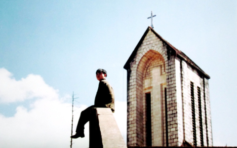 Cậu bé ngồi trước nhà thờ đá Sapa. Thị trấn của tỉnh Lào