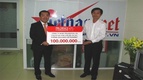 | Ông Tôn Thất Anh Vũ trao séc biểu trưng cho Báo VietNamNet |