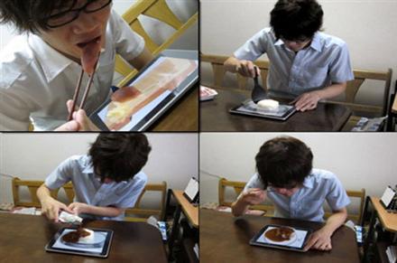 Riêng anh chàng người Nhật Takahiro Shiina trong ảnh trên lại có ý tưởng quái chiêu hơn. Shiina đã biến chiếc máy tính bảng iPad thành đĩa đựng thức ăn. Ý tưởng này cũng sành điệu đấy chứ. Shiina không những chơi công nghệ, mà còn… ăn cùng công nghệ nữa.