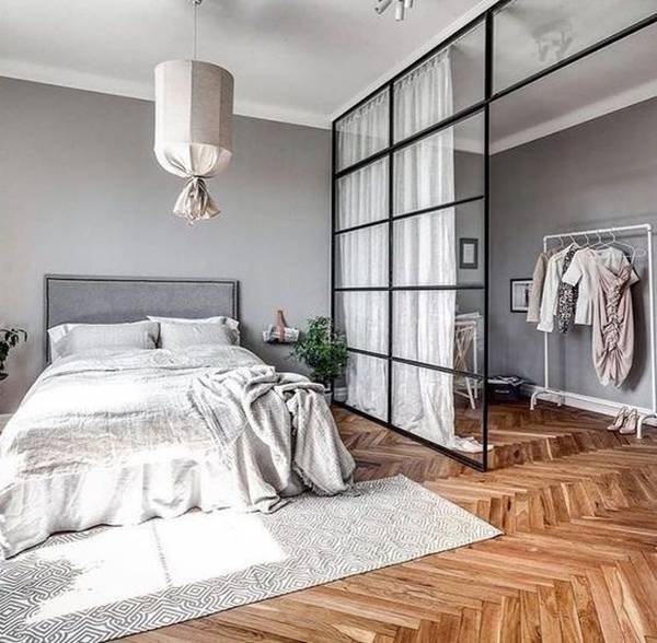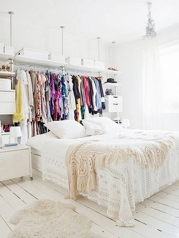 Chỉ cần một chiếc giá nhỏ, bạn đã tạo ra một vách ngăn cách chiếc giường và nơi để treo quần áo trong phòng ngủ.